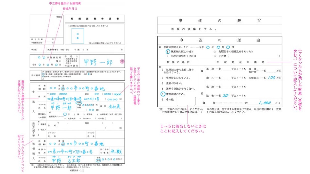 ※相続放棄の場合は、家庭裁判所に申述書を提出しなければなりません。以下は裁判所HPより申述書記入例の抜粋